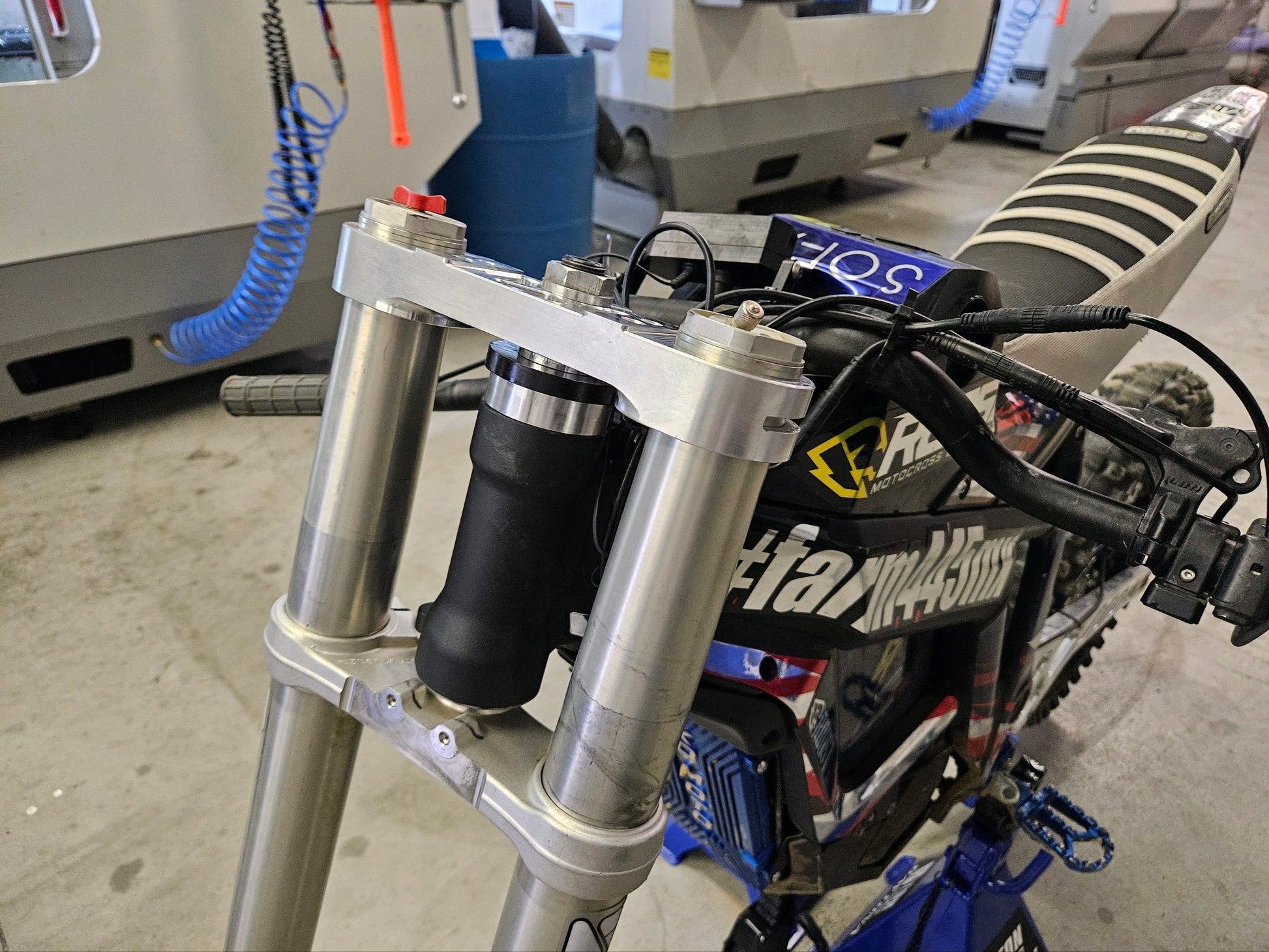 Upgraded billet aluminum upper triple clamp with spacers. With this conversion, you can put your 85 suspension off your KTM, Husky, or GasGas 85 directly on your Talaria! Anodized and Powder coat options available.